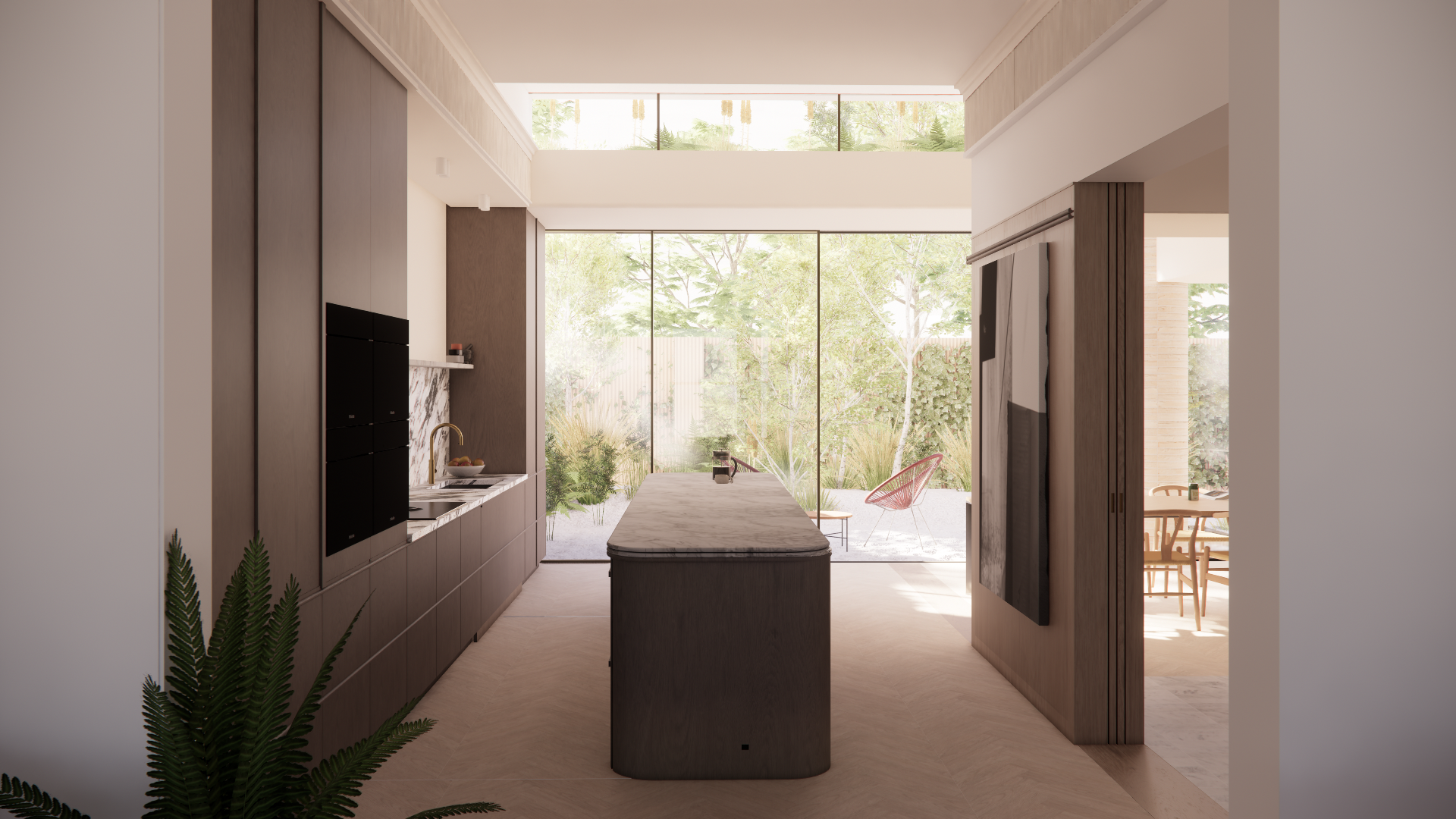 Hungerford Road is the retrofit of a semi-detached North London villa, reworking a compromised plan into a sequence of generous, light-filled spaces. A double side and rear extension unlocks the full width of the house, creating a kitchen and living space that open directly onto the garden, with clerestory glazing and a carefully modelled ceiling bringing daylight deep into the plan.